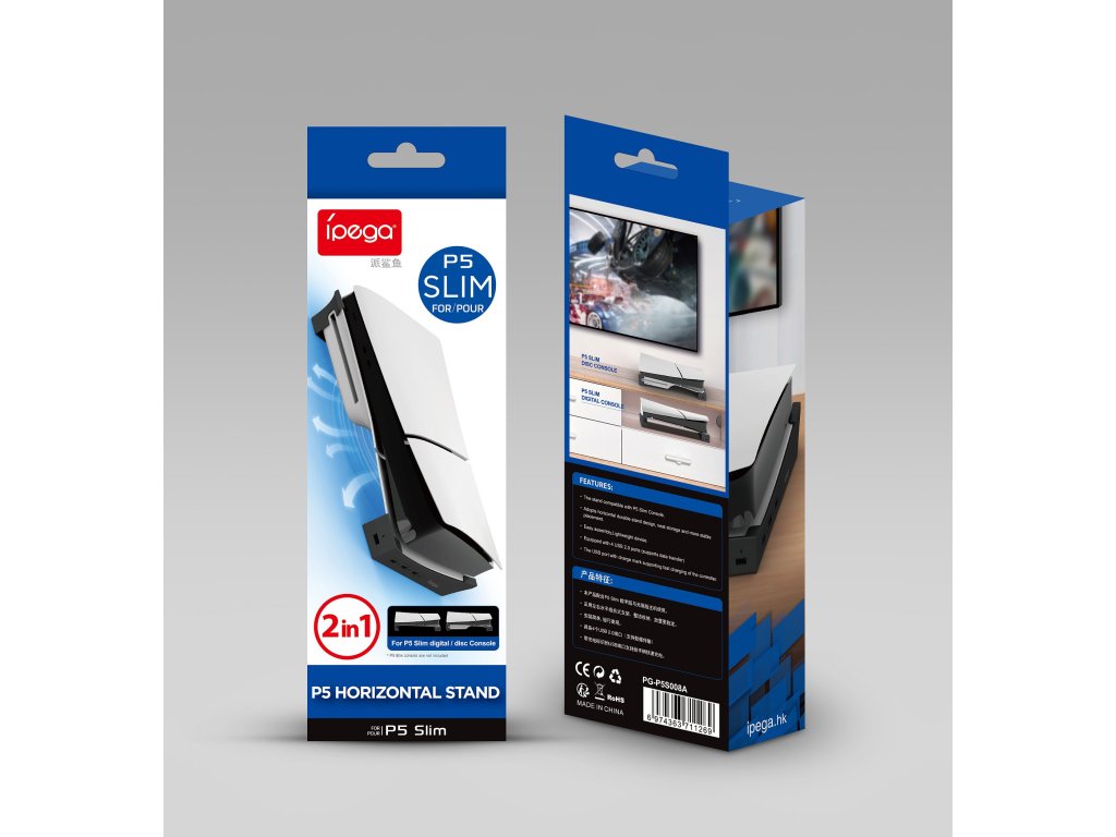 iPega P5S008 horizontální stojan určený pro Playstation 5 Slim.Stojan je vybaven USB Hubem, na kterém najdete celkem čtyři USB porty.