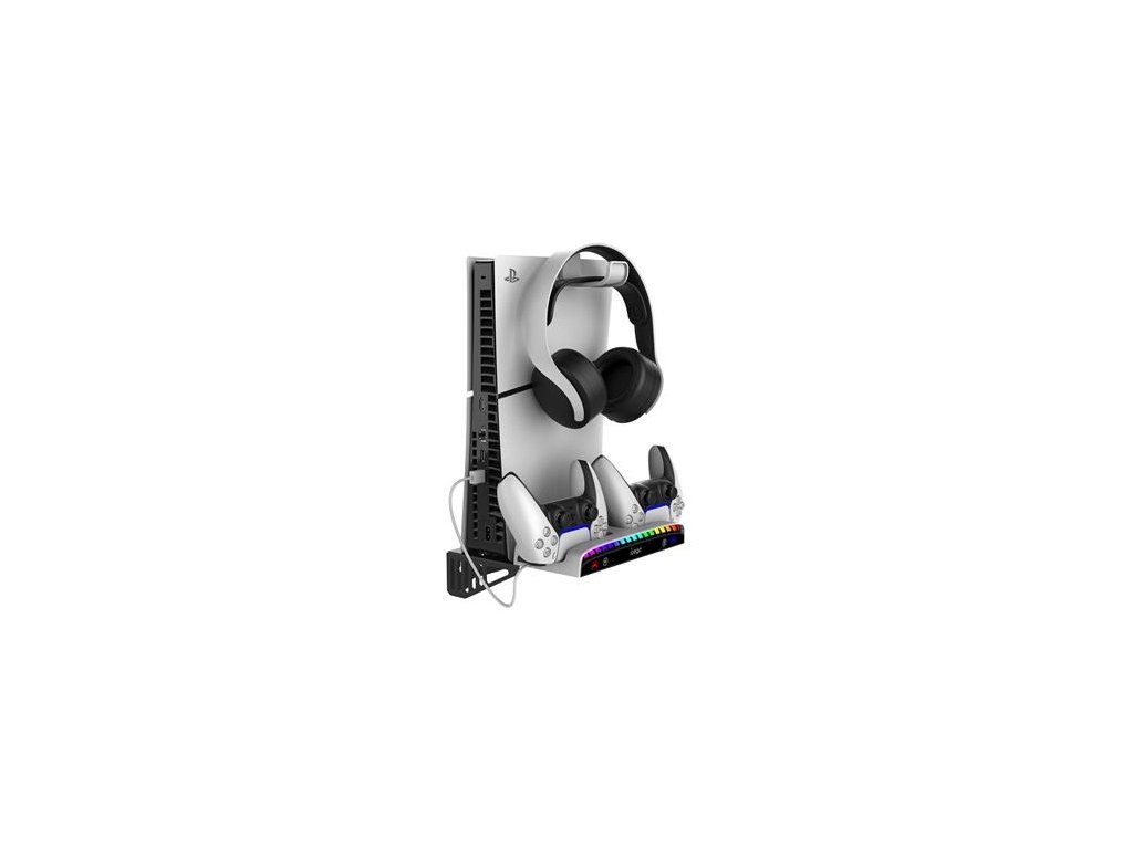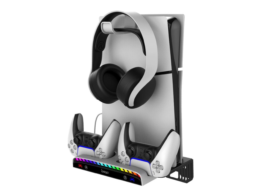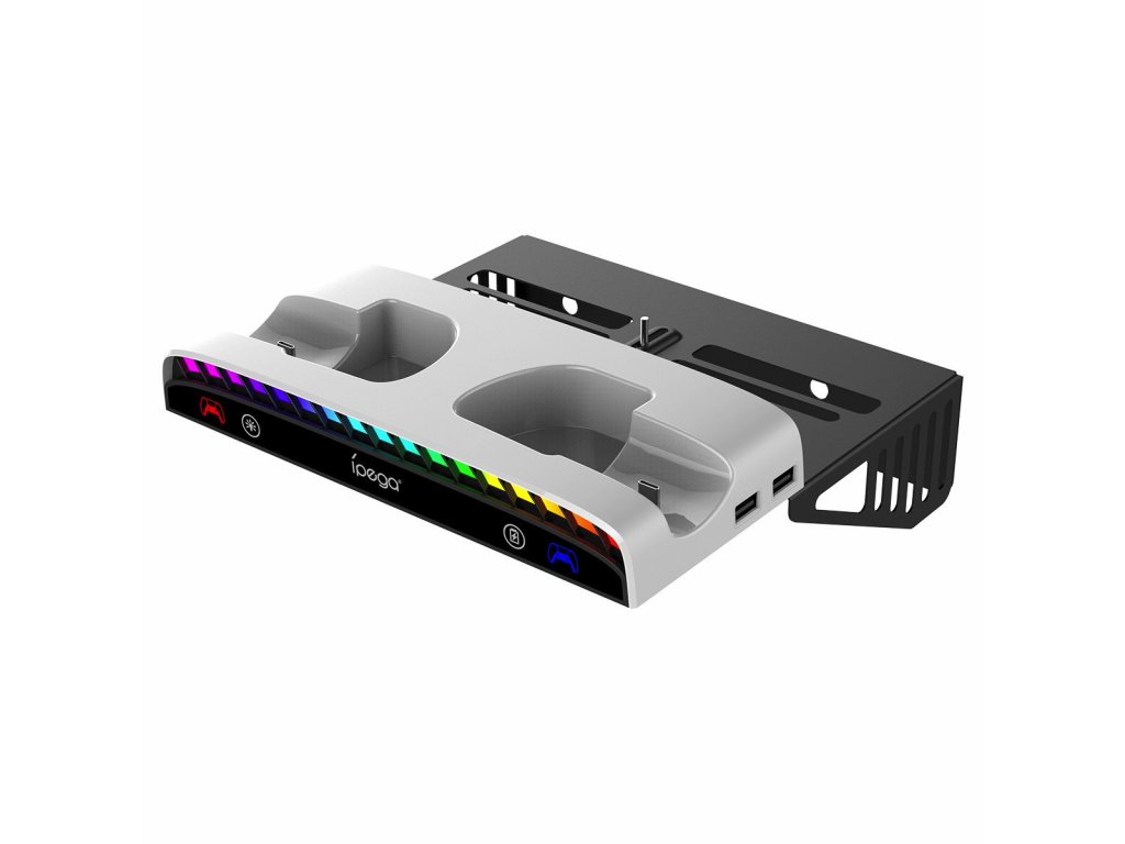 iPega P5S011 stojan na stěnu s nabíječkou pro ovladače pro Playstation 5 Slim.Stojan je vybaven háčkem pro sluchátka, nabíječkou pro dva ovladače a RGB podsvícením, kde máte na výběr z 15 světelných efektů.