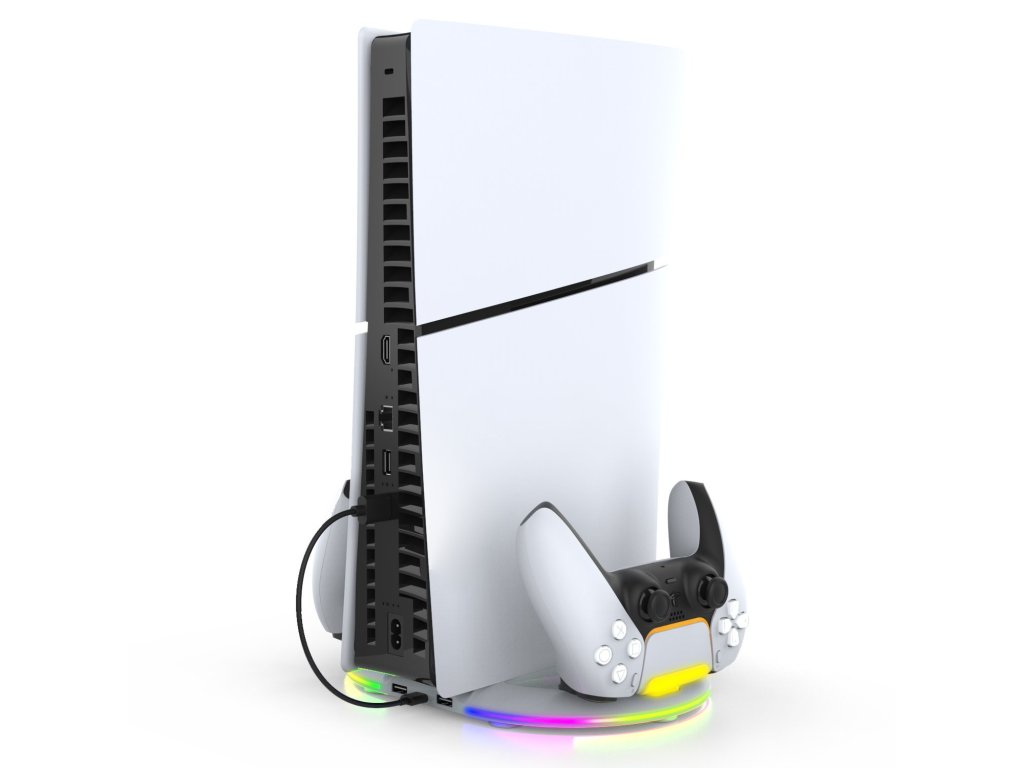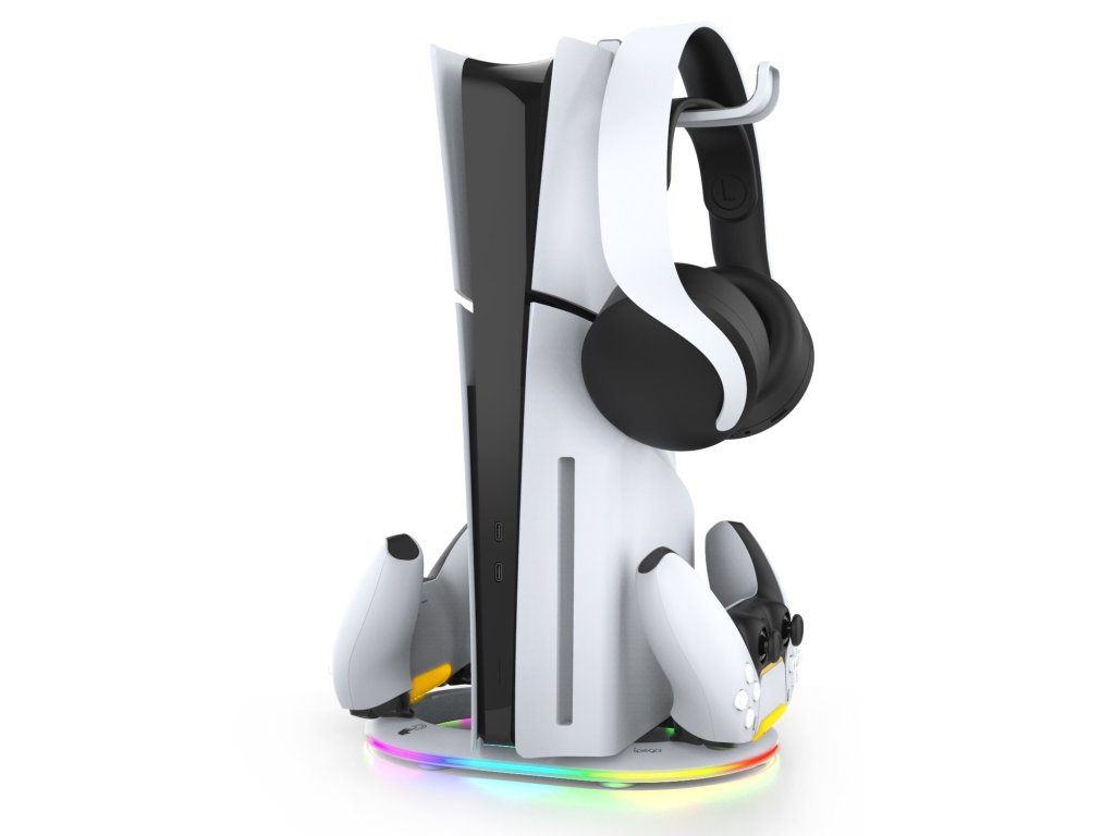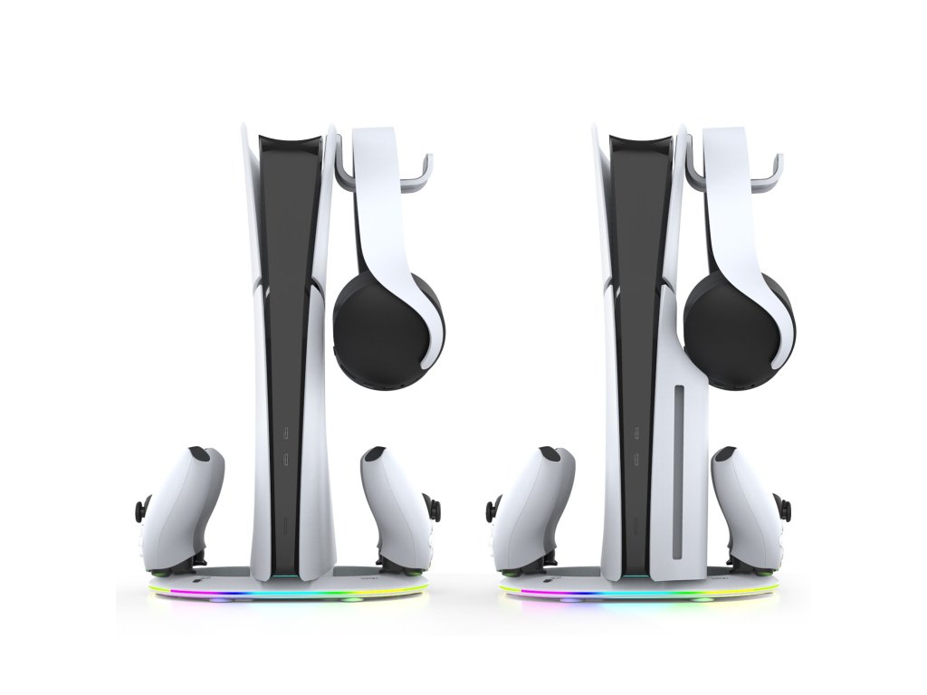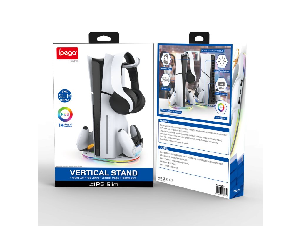 iPega P5S045 vertikální nabíjecí stojan určený pro Playstation 5/5 Slim.Stojan je vybaven nabíjecími sloty pro dva ovladače, RGB podsvícením, praktickým háčkem na sluchátka a třemi USB porty.