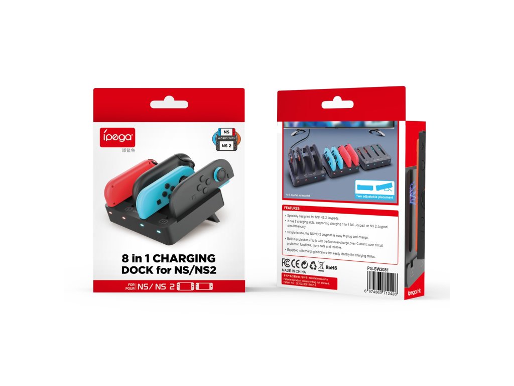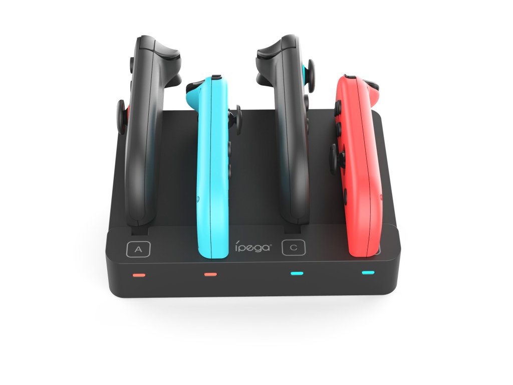 iPega SW2081 Nabíjecí stanice pro JoyCon ovladače Nintendo Switch 1 a 2.Je vybavena 8 nabíjecími sloty (4xN-S1, 4xN-S2) a podporuje současné nabíjení 1 až 4 JoyCon ovladačů.