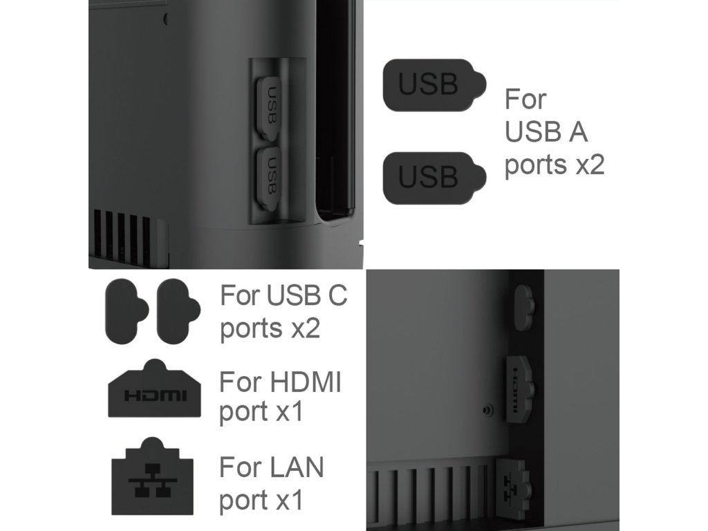 Chraňte svou herní konzoli před prachem, vlhkostí a nečistotami pomocí praktických záslepek na porty, které zabraňují zanesení a poškození nepoužívaných konektorů.