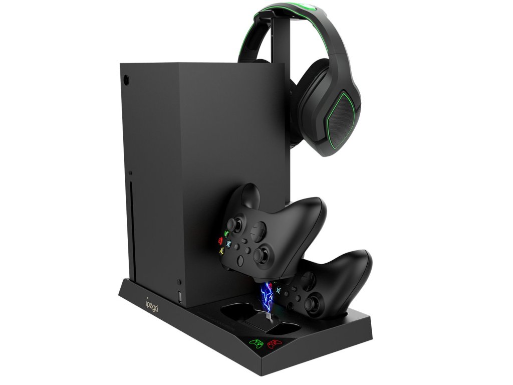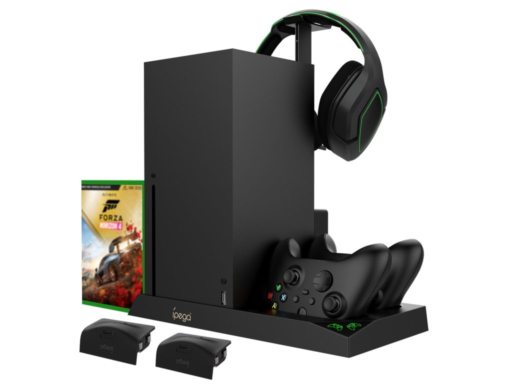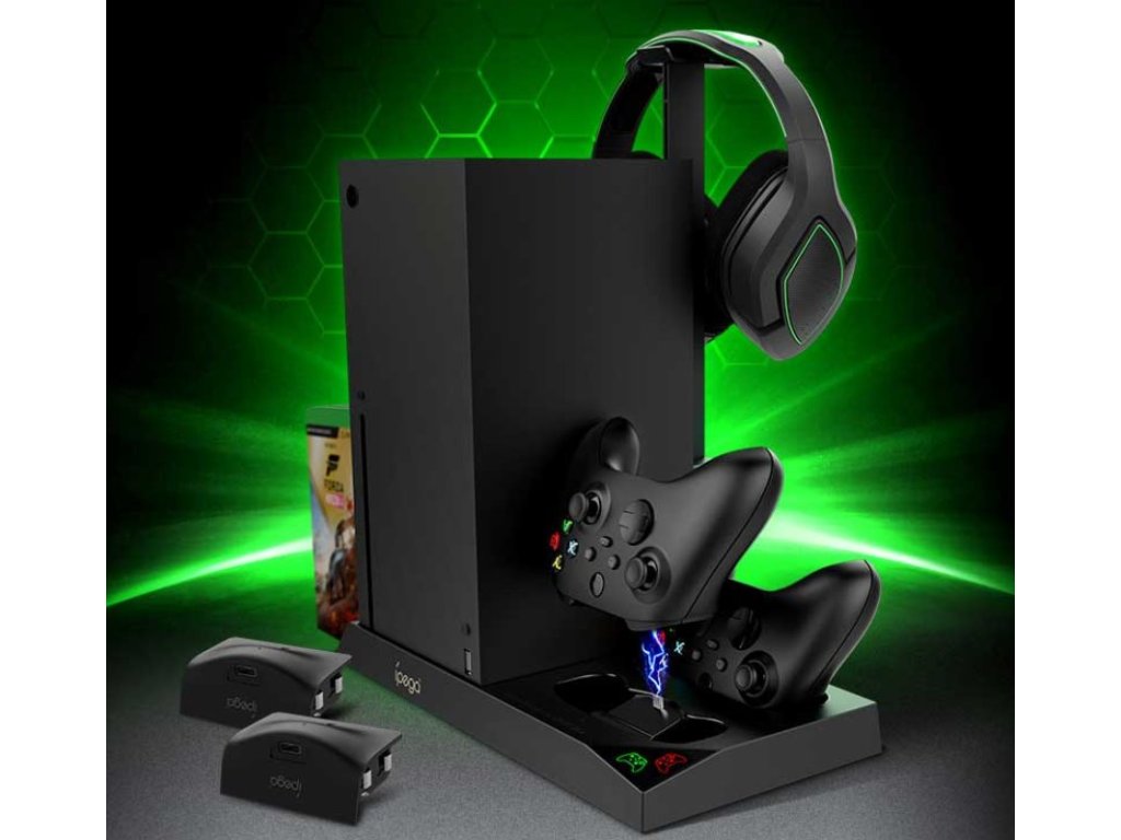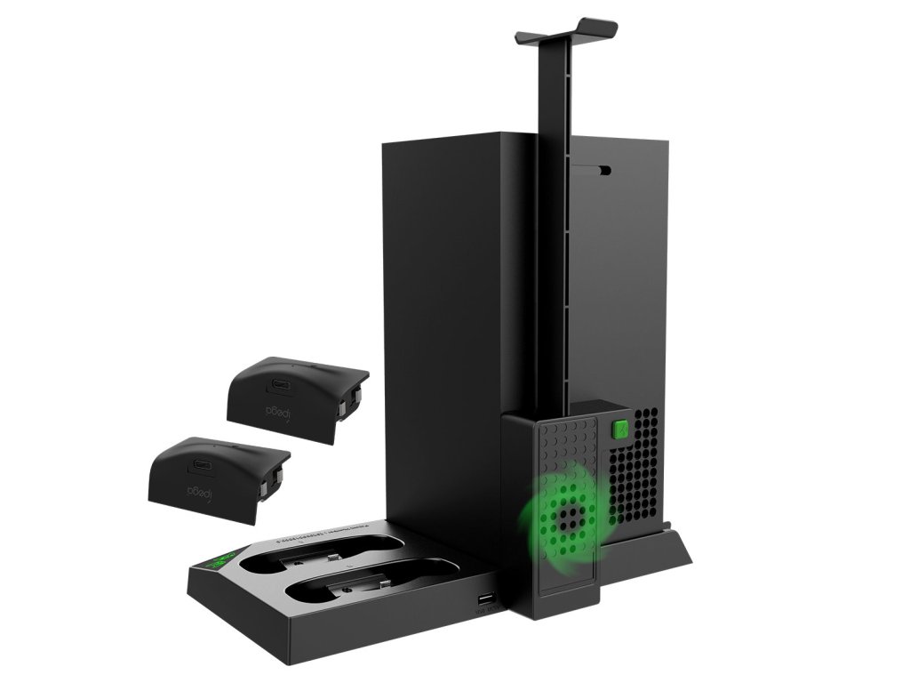 iPega XBX013 dobíjecí stanice a stojan s chlazením pro Xbox X Series se dvěma náhradními bateriemi pro originální Xbox ovladač.Praktický stojan pro váš Xbox s integrovanými ventilátory pro to nejlepší chlazení během dlouhých hodin hraní.