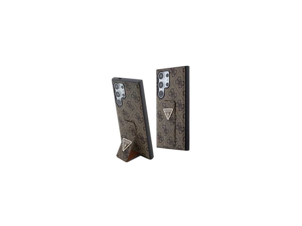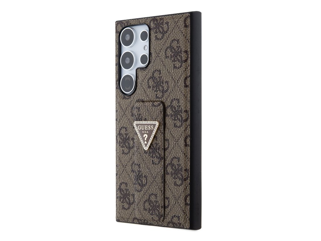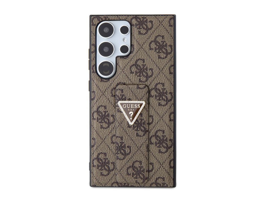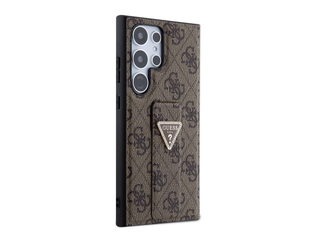 Guess PU Grip Stand 4G Strass Triangle Metal Logo Zadní Kryt pro Samsung Galaxy S24 Ultra Brown
