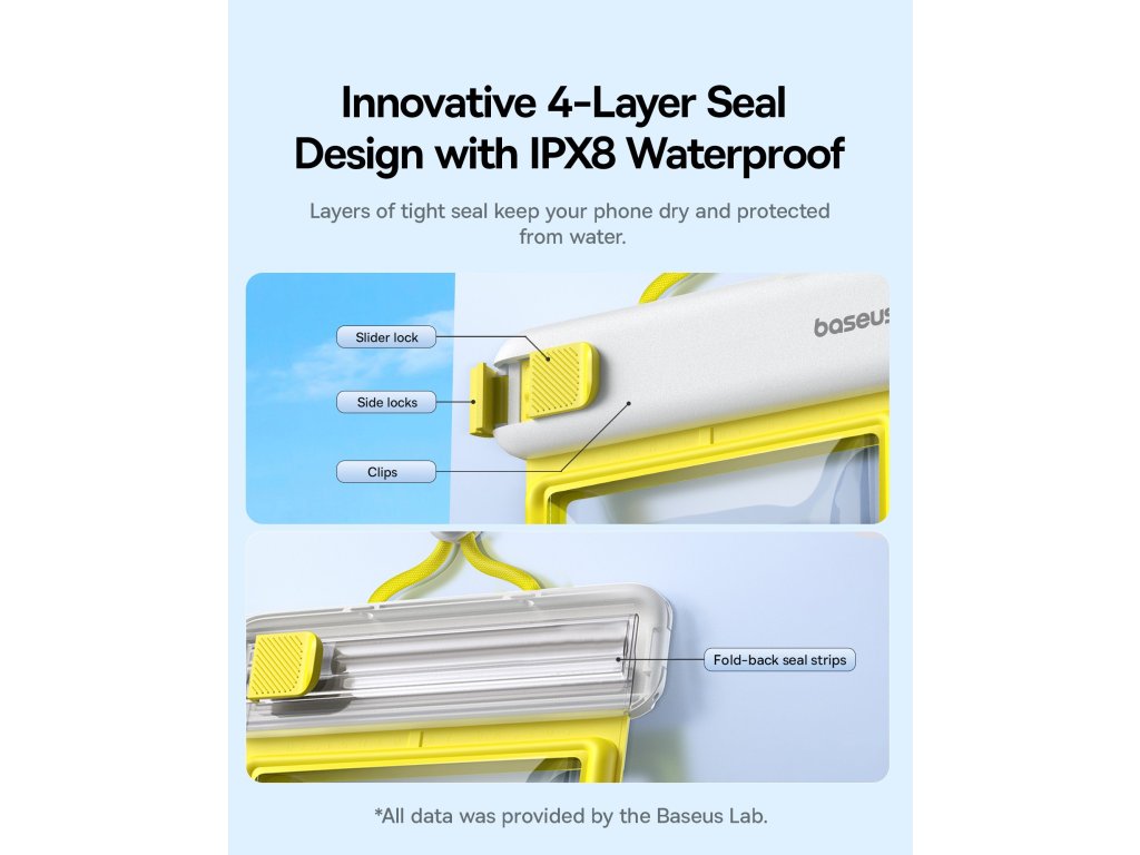 Vodotěsné pouzdro Baseus DeepDive Series je ideální volbou pro všechny, kteří si chtějí užít vodní aktivity bez obav o bezpečnost svého telefonu.Díky inovativnímu systému zacvakávacího uzávěru a čtyřem úrovním ochrany poskytuje vodotěsnou ochranu až do hloubky 30 metrů pod vodou.