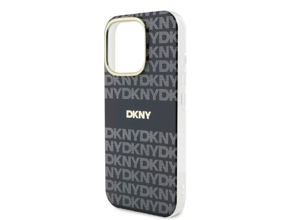 Design krytu telefonu má elegantní, moderní estetiku s opakujícím se vzorem loga "DKNY" po celé zadní straně a výrazným pruhem s nepřehlédnutelným ikonickým logem.