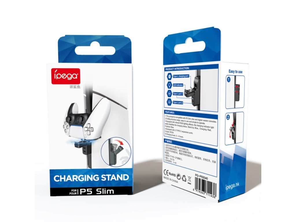 iPega P5S040 kompaktní skládací nabíjecí stanice pro Playstation ovladač. Kompatibilní s Playstation 5 Slim.Stačí připojit do USB-C portu konzole, vyklopit nabíjecí port a připojit ovladač. Tak snadné to je.