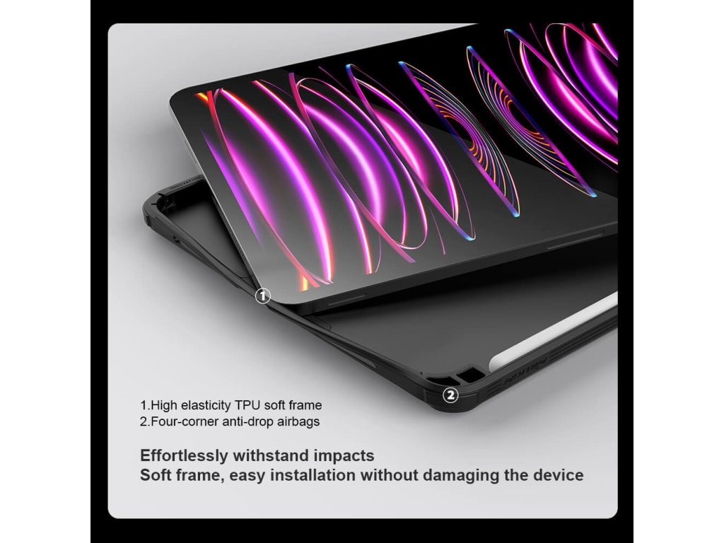 CamShield Pad zadní kryt je multifunkční kryt navržený pro tablety, který spojuje styl, ochranu a praktické funkce do jednoho.Kryt je vyroben z kombinace odolných materiálů TPU a PC, které zajišťují vynikající ochranu proti pádu, poškrábáním, nárazům i ohýbání.