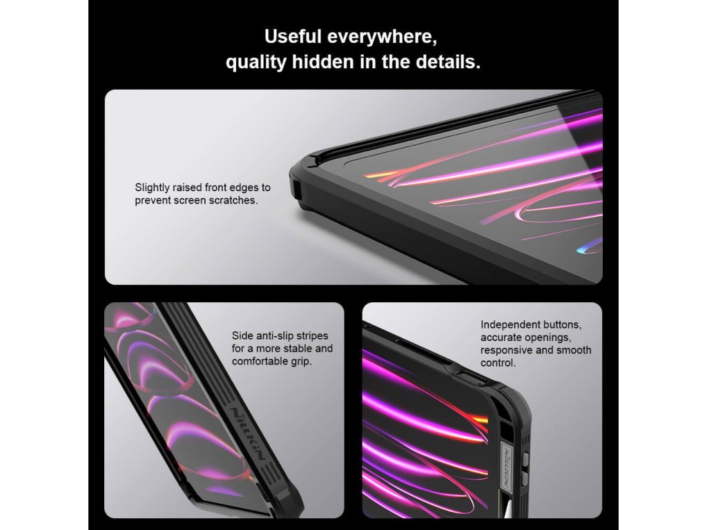 Detaily jako mírně zvýšené okraje proti poškrábání displeje, postranní protiskluzové pruhy pro lepší úchop a citlivá, přesná tlačítka dělají z tohoto krytu ideální ochranu pro váš tablet, připravenou zvládnout každou situaci.