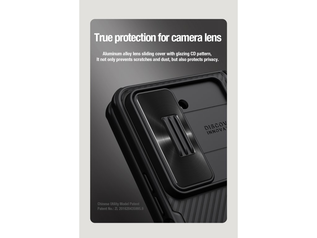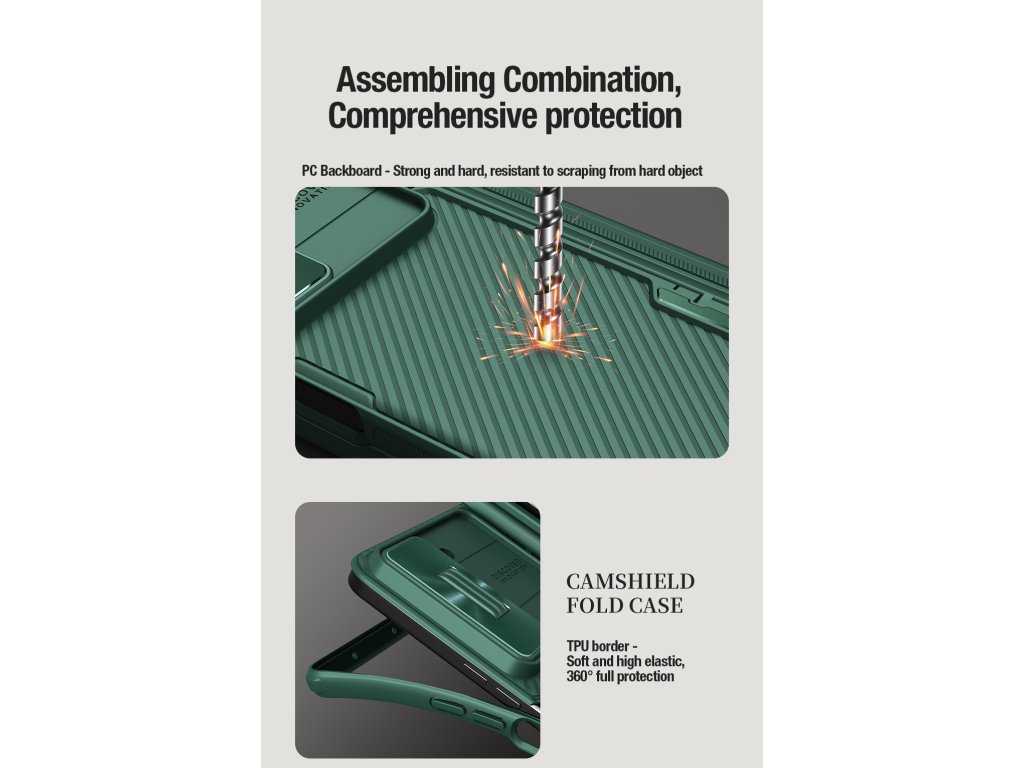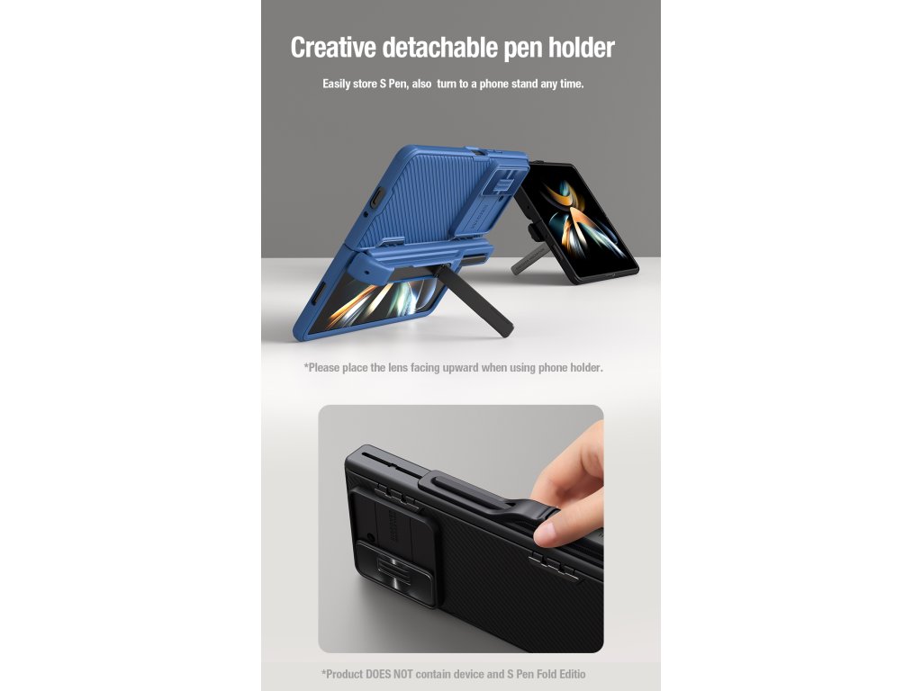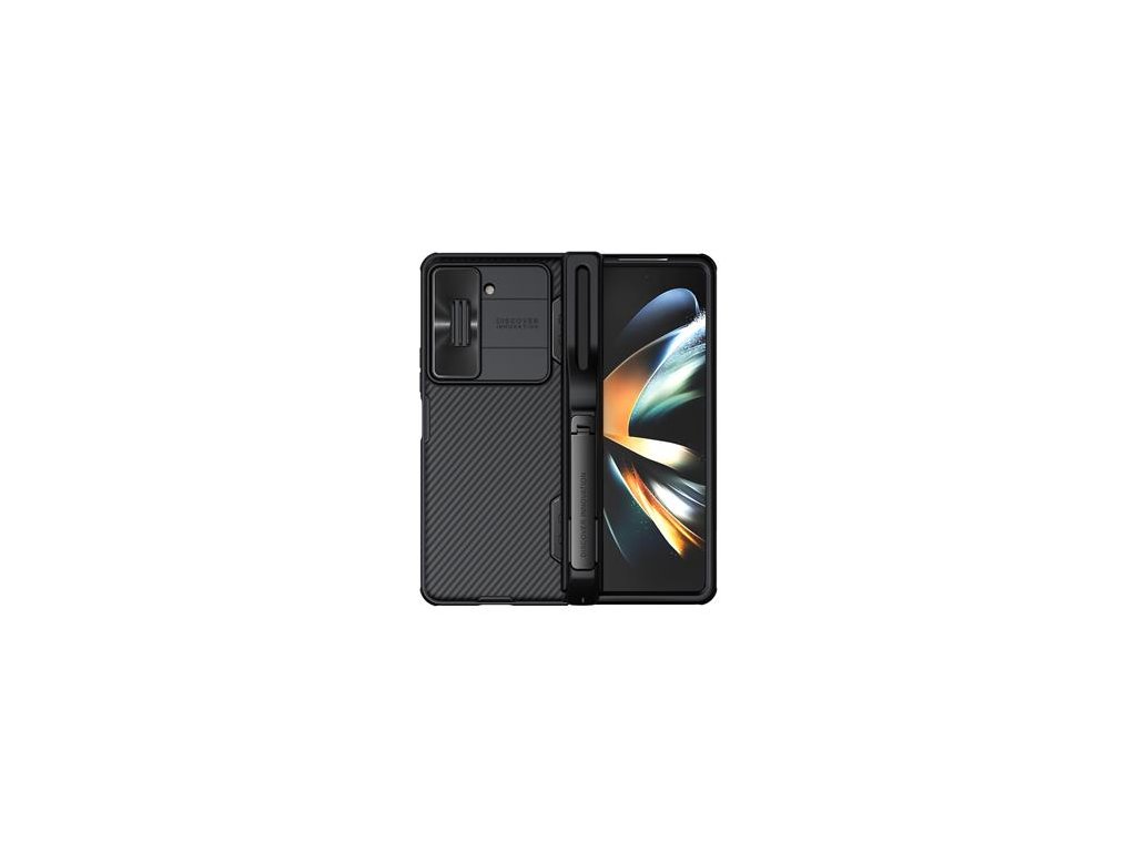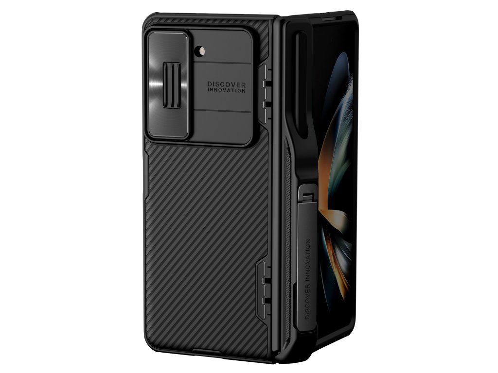 Nillkin CamShield FOLD Slot + Stand je unikátní kryt s posuvným krytem čočky fotoaparátu, výklopným stojánkem a držákem na S Pen.Navíc je unikátní v tom, že se skládá ze dvou materiálů.